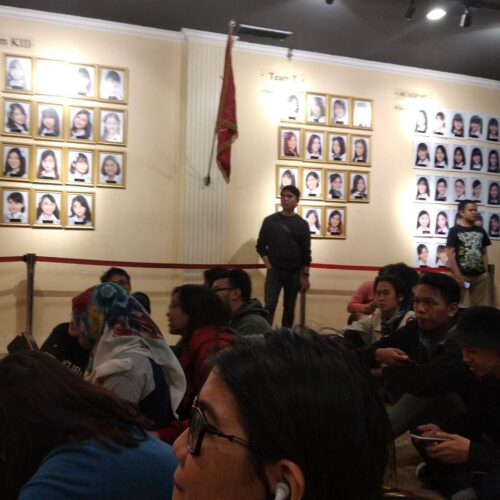 Setelah pertunjukan berakhir kami diajak hitouch dengan member di pintu keluar (bheey, pede sekali diajak). Yah intinya sembari jalan keluar kita dipersilahkan hi touch atau toss dengan member jkt48.